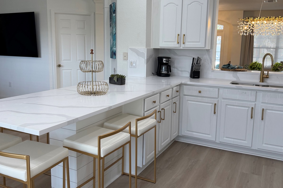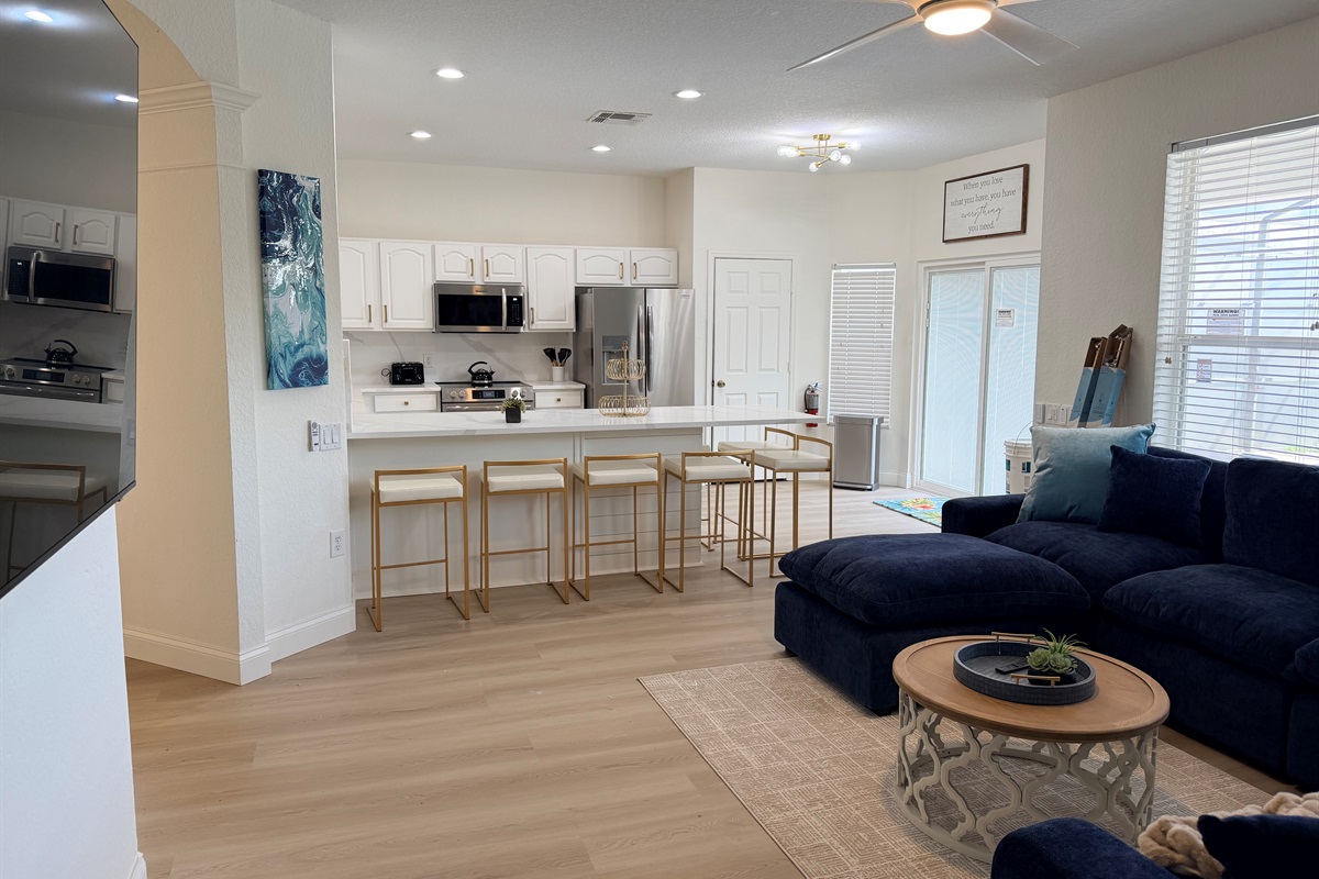 "Cinderella's Castle" has luxury upgrades throughout with brand new flooring, paint, beds, pillows, comforters, towels, sheets, furniture, curtains, flat screen SMART mounted TV's, extended kitchen Island, new appliances, patio dining for 12 with an outdoor TV, SOUTH FACING POOL, all of the kitchen accessories, plates, glasses, dishes, bakeware and pans, even a deluxe Keurig with latte maker! Everything is new! Be one of the first to enjoy!