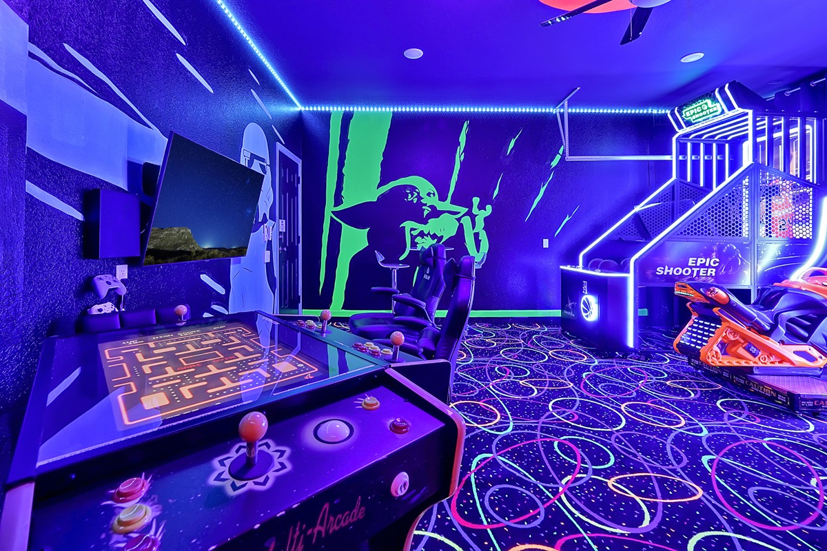 HOUSE MICKEY is a 6 bedroom, 4 bathroom executive home which has recently been remodeled. There have been the following upgrades: new carpets, new roof, new granite kitchen counter, new furniture, paint, furnishings, comforters, curtains, kitchen appliances and accessories, luxury towels and linens and a BRAND NEW 65" Smart TV for the family room. The garage was converted to an air conditioned Star Wars GAME ROOM with a slate pool table, foosball table and Brand New 900 game commercial two person arcade console and an XBOX One gaming station with new games.
